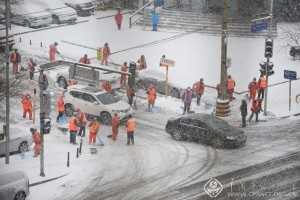 2月6日,北京丰台,环卫工人正在清扫路边积雪。张健 摄