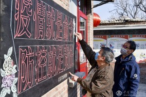 1月30日,北京前门街道大江社区,居民书写防控宣传板报。张传东 摄