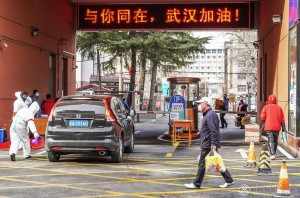 3月29日,北京,与你同在,武汉加油!某小区门口的工作人员正在对进入车辆进行消毒。易国跃 摄