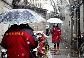 2月14日,北京东城,社区治安志愿者正在冒雪排查。吴强 摄