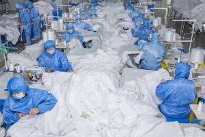 2月28人,河南省平顶山市郏县圣光医用制品股份有限公司防护服生产厂商正在加紧生产。李利国 摄
