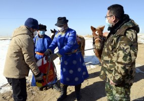 2月6日,内蒙古包头市牧区防控工作人员为牧民运送生活物资。秦文秀 摄