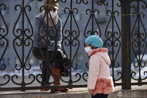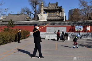 3月14日,呼和浩特玉泉区五塔寺前街,戴口罩晨练的居民。 吴运生 摄