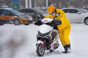 3月3日,风雪路上的外卖小哥。 在战“疫”中, 总有一些人在积雪结冰、泥泞湿滑的风雪道路上,迈着艰难而坚实脚步逆寒而动,把温暖送到你的家中;总有一幕一幕格外醒目的身影,让你有一种莫名的感动,他们就是普通再普通为生活打拼的外卖小哥。张青林 摄