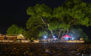 金溪大坊村灯光通明,村民在巨樟下休闲、摆摊。(李山冕 摄)