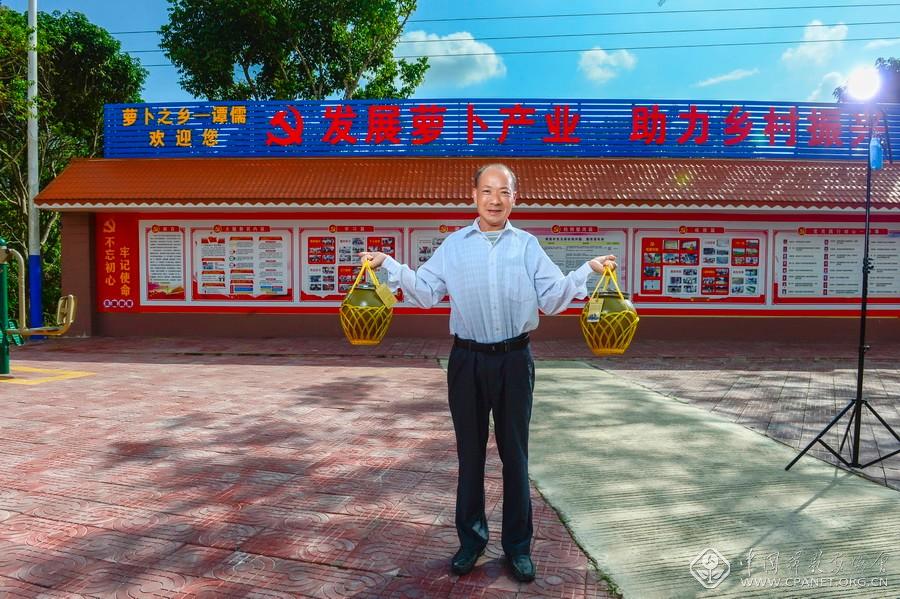 驻村第一书记扶贫干部邱伟正展示与省内知名企业共同打造的扶贫产品——谭儒萝卜干。