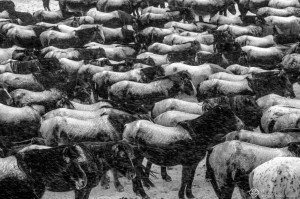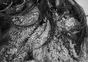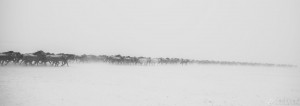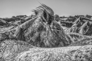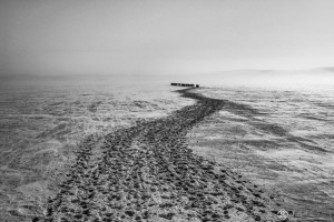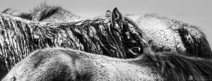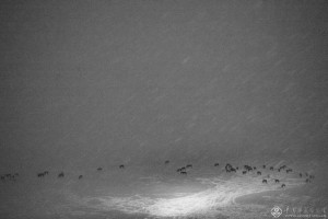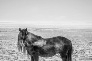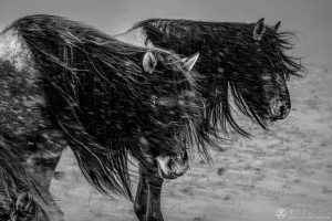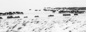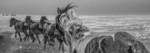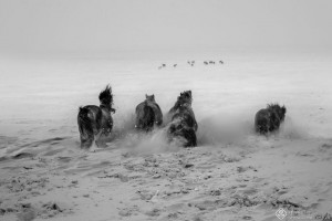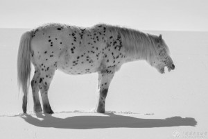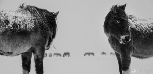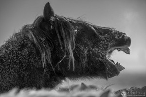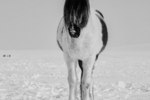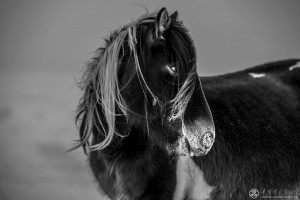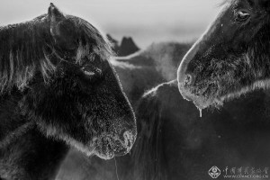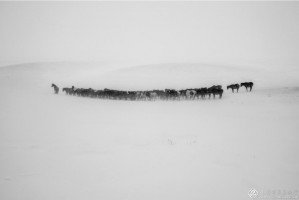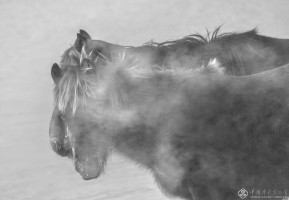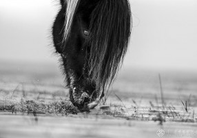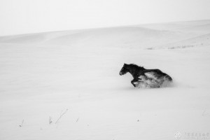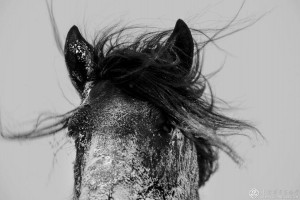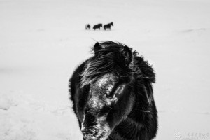 它们那不惧风雪、顶天立地的形象,从未被驯服的野狼般的眼神;雄马那未曾被修剪过的鬃毛,未曾被羁绊过的英气;-46℃的严寒中浑身挂满白霜,仍在刨食积雪下牧草的豪气;为防狼群袭击彻夜不眠看护马群后,在阳光下站立睡着的群主雄马肖像;在无垠的雪地里吃饱后打哈欠的马儿如狼似虎般的凶猛状态;整夜冒雪奔跑百里寻找到如意的草场后不停地刨食的生命力;耸立在风雪连绵天地间的英雄气概,顶风屹立如铜墙铁壁般团结的力量;在银装素裹的世界里奋勇前进的马群……都一一记录在我的镜头里。