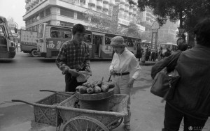 1991年深圳市红岭南路上一位小贩在出售烤红薯,这是当年街头最吸引人的美食。