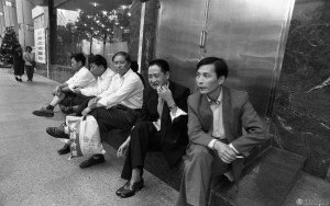 1991年深圳市深南东路几位来自内地考察的干部正在银行门口休息。