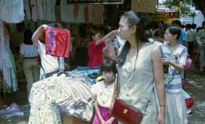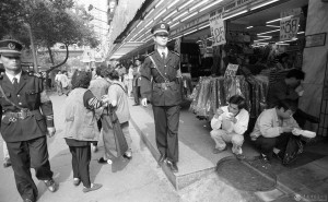 1991年,深圳市的大超市在批发各种时装,保安在街道上执行巡逻保障商户和顾客的安全。