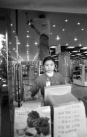 1991年,深圳市某商场门口,一对前来购物的情侣正在等待制作的蛋糕。