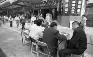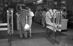 1991年,深圳市商业中心商场的入口处服务员和修理工。