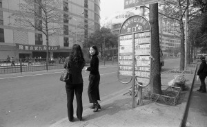 1991年在深圳市东门两位候车的女士。当年的公共候车亭还很简易,而且公交车发车时间间隔较长。