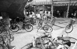 1991年,深圳市老东门,那个年代大家出行都靠自行车,停放自行车的地方也极其不规范,市民们也熟视无睹,商家也冷眼观看,无可奈何。深圳人习惯称之为“老东门”的深圳老街形成于明代中期,又叫“深圳旧墟”,地处深圳市罗湖区深南东路以北,以现今的东门中路、人民北路、解放路、湖贝路等主要街道为构架。深圳市区就是以此为基点发展起来的。
