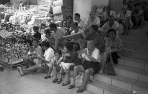 1991年夏天,深圳市商业中心在商场门口蹭空调的老人、妇女和儿童。