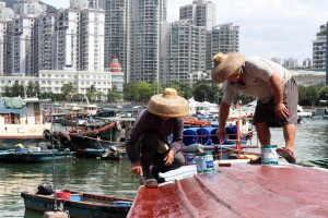 2018年,深圳市南山区渔港码头,城市的高楼正在拔地而起,烈日下渔民们正在为渔船上油漆养护。