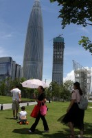 2018年深圳市南山区,深圳湾畔市民们正在公园里享受假期。占地 80,000 平方米的万象城购物中心及高达约392_5米的华润总部大厦“春笋”、商业中心、文化艺术中心、安达仕酒店、Park View Manor住宅等组成,创造出城市湾区建筑群中一个多业态极致融合的活力中心。