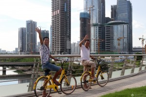2018年,深圳市南山区前海滩涂正在发生着巨大的变化,两位建设者正骑着共享单车浏览新市容。