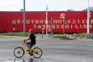 2018年,深圳市南山区前海,在红色的标语前骑着共享单车的老人,他的眼前正在发生着巨大的变化。