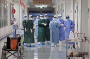2月21日,医护人员在新冠肺炎病区交接班。李舸摄
