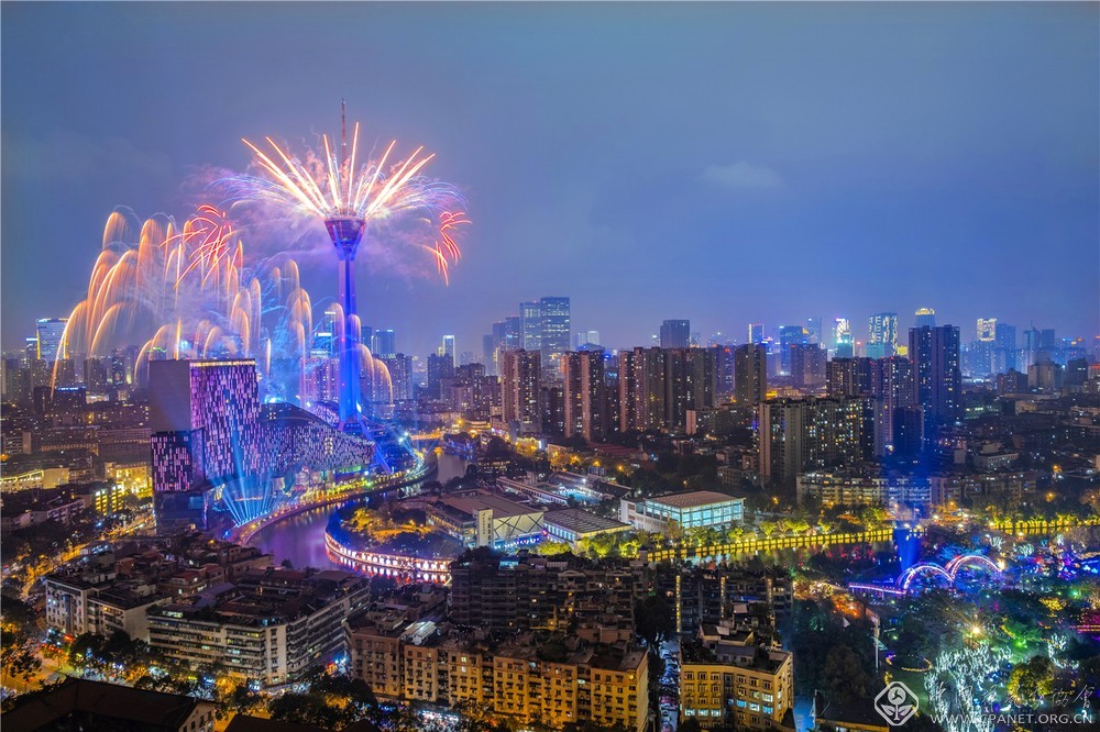 邓显杰《节日的绽放》2019年2月19日,成都天府熊猫塔上演光电烟花秀,变身为全国首个5G电视塔。