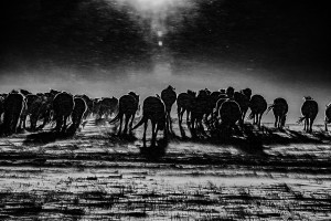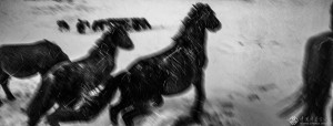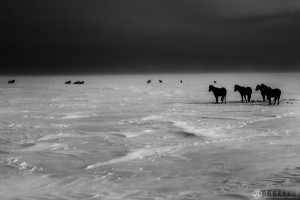 当张牙舞爪的白毛风一次次肆虐的零下四十多度的数九寒冬,别说是人就是飞禽走兽也绝迹的旷野中唯一能见到的生灵就是蒙古马。它们那不惧风雪顶天立地的形象、从未被驯服的野狼般的眼神、雄马那未曾修剪过的鬃毛、未曾被羁绊过的英气、-46℃的严寒中浑身挂满白霜仍在刨食积雪下牧草的豪气、为防狼群袭击彻夜不眠看护马群后白天在阳光下站着睡的群主雄马肖像、在无垠的雪地里吃饱后打哈欠的马儿虎豹般的凶猛姿势、整夜冒雪奔跑百里寻找到如意的草场不停地刨食的生命力、鼎立在风雪连绵的天地间那英雄气概、顶风屹立的铜墙铁壁般团结的力量、在银装素裹的世界里马不停蹄前进的马群......一幅幅浸透着苍凉诗意的雪域草原和狂野、不羁与隐忍的蒙古马形象都一一记录在我的影像里。