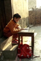 2003年3月,上一年级吴苗星期天在家门口自习。