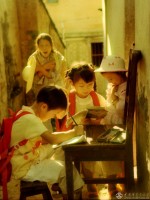 2004年7月,上二年级吴苗8岁(左一)与小朋友吴徽丽10岁三年级(左二)妹妹吴徽婷6岁(左三)在家门口自习。