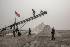 盐池的开发约有4000年的历史,在中条山下的盐湖里机械化作业的盐工。