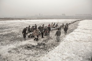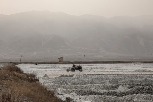 正在进行收硝前的排水作业,通过挖成的水渠把池子里的水引向另一个池子。经过风干凝结后,便于收硝。