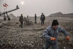 半机械化的人工作业,成本费用相对低些,成为每个工段主要的作业模式。正在挪动传输架的盐工。