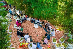 《林中奏响丰收曲》(2022年8月13日,四川省乐山市沐川县大楠镇石碑村)(三伏天,村民在绿色的林间,喜摘丰收了的猕猴桃,父老乡亲相帮相助,你来我往,挑选装箱上车,大家累并快乐着。)作者:周琳