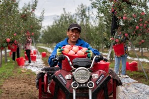 《苹果红了》(2021年9月5日,山西省临汾市乡宁县昌宁镇西廒村)(产业脱贫,乡村振兴。苹果产业给果农带来了实惠,三十亩苹果园让乡宁县昌宁镇西廒村的刘润生每年都有十五万元的收入,彻底告别了贫困。图为老刘喜收苹果的场景。)作者:梁建法