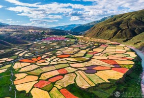 《七彩田园》(2022年8月6日,四川省甘孜藏族自治州炉霍县)(炉霍县虾拉沱镇瓦达村藏族村落的四周,片片青稞已经成熟,部分已经收割,与其他作物一起组成一幅七彩斑斓的的乡村田园风光。)作者:蒋文武