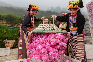 《“倾卸“芬芳》(2022年7月2日,四川省阿坝藏族羌族自治州小金县新桥乡)(小金县新桥乡共和村,2022年已采摘食用玫瑰20余吨,可实现经济收入近300万元。今年全村靠卖玫瑰净增收有望达到400余万元,每户农民年收入达到几万。)作者:高发明