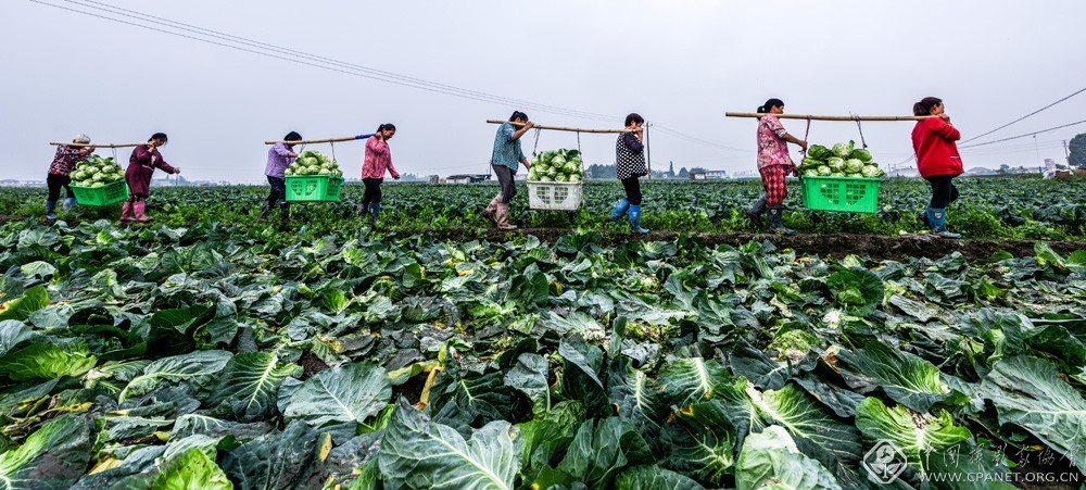 《姐妹收菜队》(2022年5月19日 , 四川省德阳市广汉市连山镇川江村)(收菜的姐妹们抬着收割的白菜到公路上,准备用货车转运外销。)作者:党元清