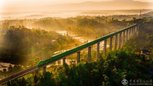 《山村来了“绿巨人”》(2022年4月21日,四川省广安市广安区化龙乡渡口村)(一列动车从美丽的山村驶过,恰似乡村振兴驶入了快车道。)作者:柴剑波