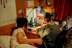 2017年5月19日,晚上学习妈妈不时地给奕雯扇着扇子。
