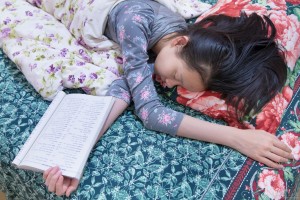 2018年4月25日,明天期中考试,晚上学习的雯雯看着书睡着了。晚上学习看书背题有很多次都是这样睡着了。