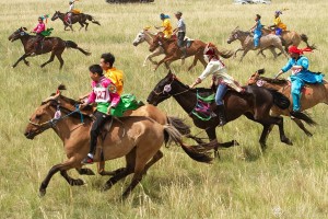 内蒙古锡林郭勒草原“那达慕”的赛马比赛是直线距离比速度,很少有圆圈跑道,主要由蒙古马参赛,一般距离直线长度为5—30公里不等,取决于“那达慕”规模的大小。在牧民自家举办的小型家庭那达慕上,参赛的马一般为10—20匹,这样比赛的距离也就5—10公里左右。如果是大型“那达慕”,参赛的马匹和距离就要远高于家庭“那达慕”。