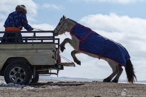 小汽车拉马去参加赛马,赛马很熟练的“上车”,拍摄于2015年 3月8日。