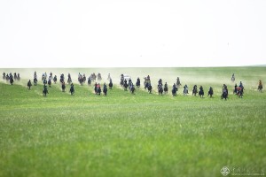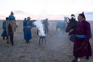 参赛的赛马集中后转圈牛粪烟再去起点,这是一种传统习俗,拍摄于2014年 10月4日。