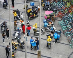 2019年3月30日,四川省成都市,年轻的“上班族”在中心提督街的一栋写字楼下取午餐外卖。中国经济稳步迈向高质量发展,消费市场不断扩容提质,新业态与新趋势蓬勃发展。 朱大忠 摄