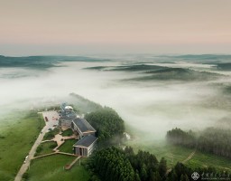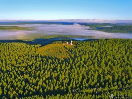 于磊-无人机视角下,塞罕坝的防火监测点高高的望海楼,在一望无际的茫茫林海中格外显眼。