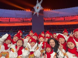 张曼华-2022年2月4日,来自革命老区阜平县的马兰花儿童合唱团在冬奥会的开幕式上,用希腊语演唱了《奥林匹克颂》,开幕式结束后老师和孩子们在鸟巢主火炬前留影。