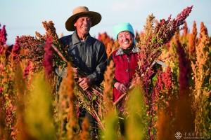 赵占南-被誉为“中国瑜伽第一村”的张北县玉狗梁村,试种藜麦成功、农民收入大幅增加,村民郭明与老伴儿沉醉在收获的喜悦中。