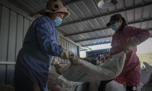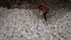 2023年2月13日,工人整理待利用的淘汰蘑菇包。淘汰蘑菇包可用于牛羊蚯蚓的养殖、蘑菇栽培再利用和有机肥制备等。