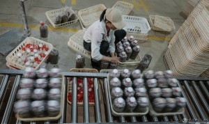 2023年3月12日,工人在精心检查流水线输送的蘑菇包,拧紧个别松动的蘑菇包,以防污染。