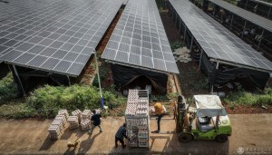 2023年3月12日,在海南省定安县“农光互补—光伏食用菌”项目基地,工人们齐心搬运蘑菇包,为在光伏下种植做足准备。基地将光伏电站和食用菌大棚建设合二为一,上可发电,下可种植,实现农光互补。