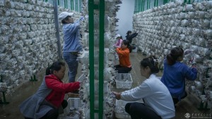 2023年2月13日,工人正在采摘“发育”成熟的小蘑菇。该基地日产4万个蘑菇包,相当于日“食”农林废弃物30吨。